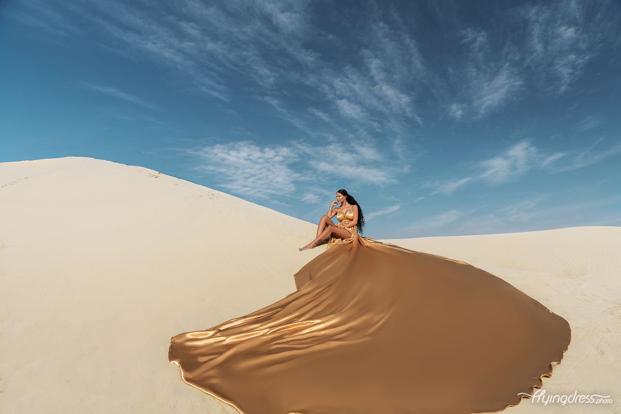 The scale creates drama. The vastness of the desert gives flying dress images an incredible sense of scale. Tiny figure, enormous dunes, infinite sky — it's a composition that commands attention.